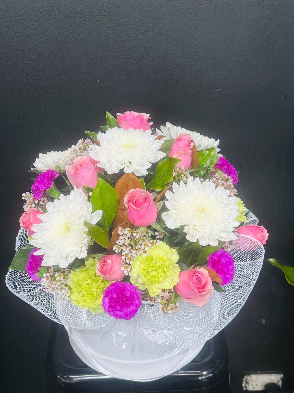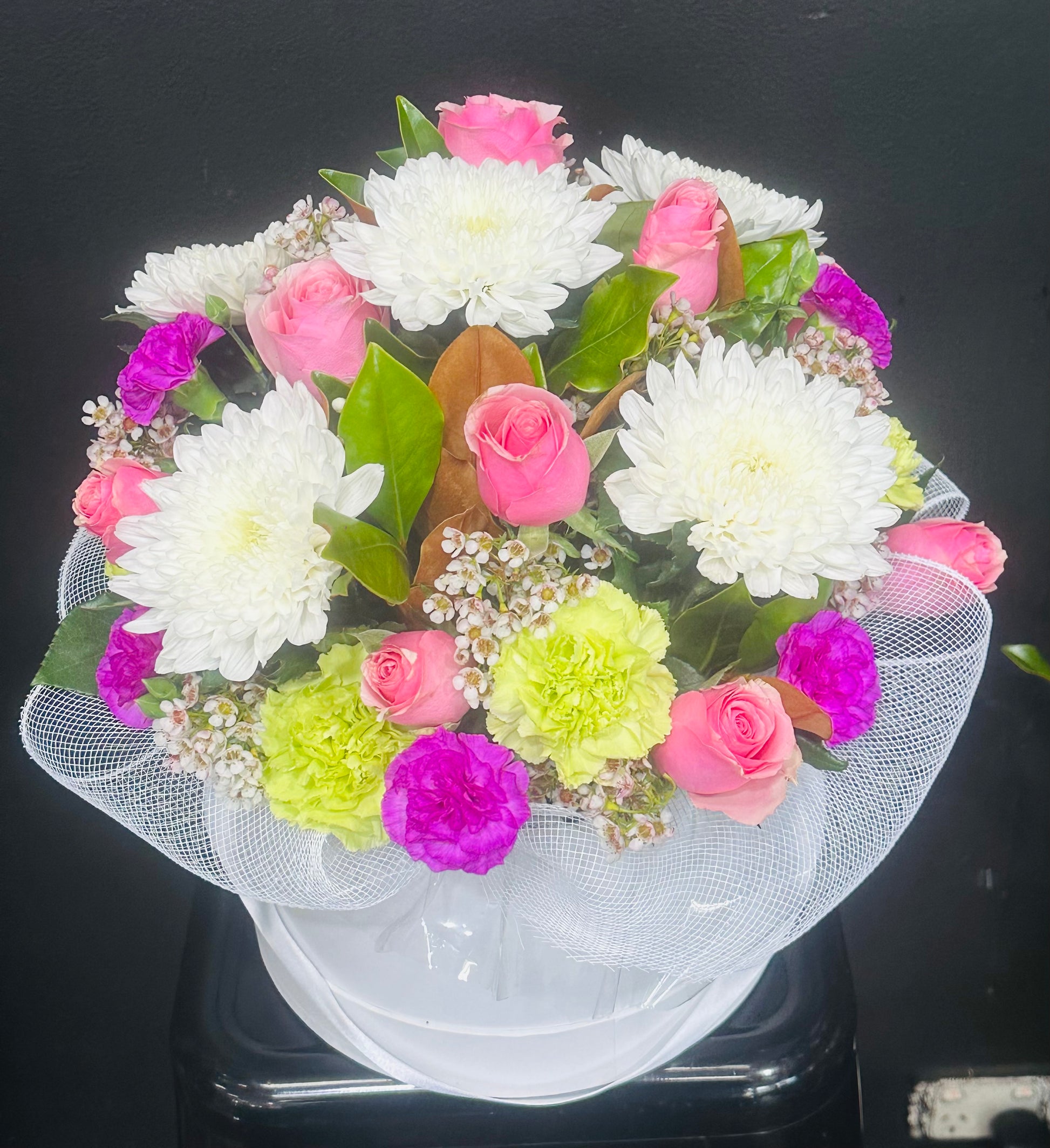 Perfectly designed Hat Box arrangement with Roses, Disbuds, Carnation, Magnolia leaves, Wax flowers, and other mixed greenery.