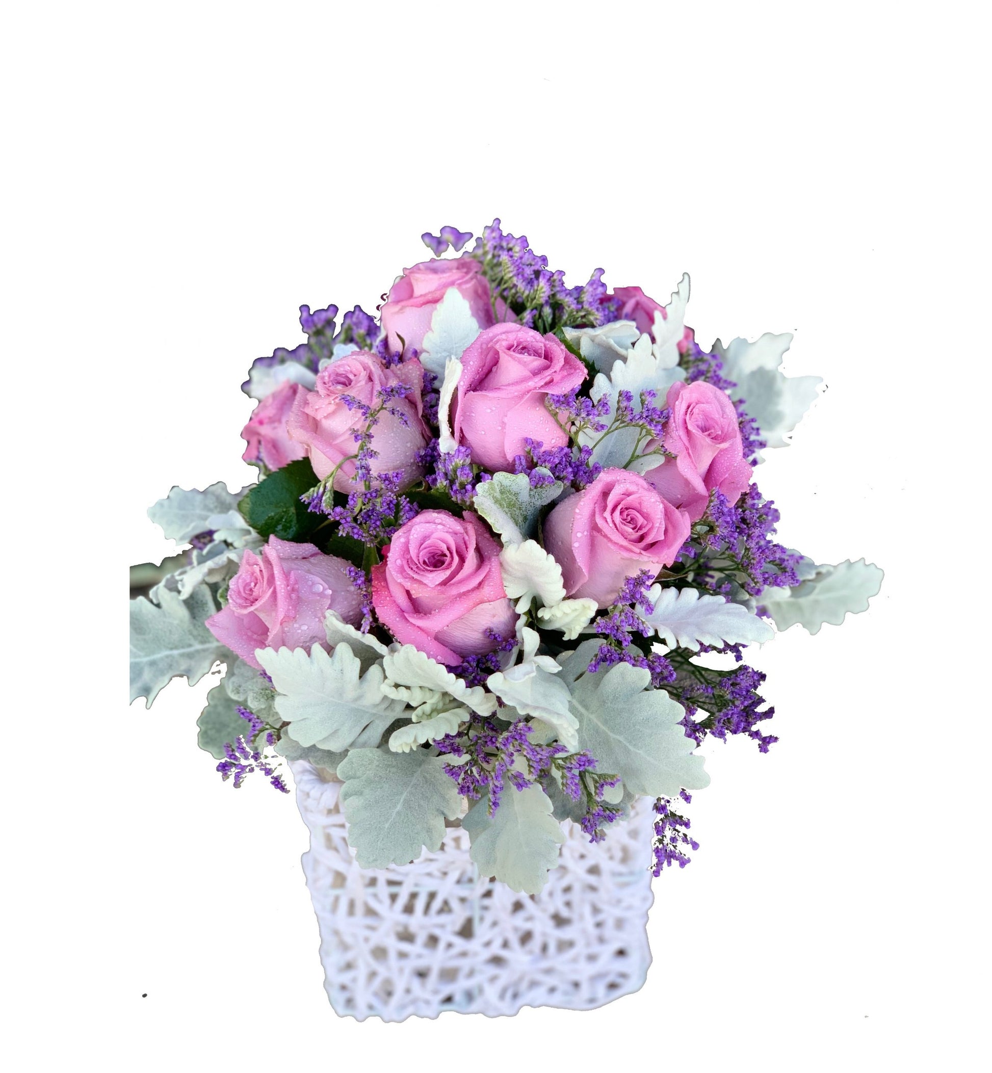 Make your Valentine's Day unforgettable with our White Basket adorned with Pink Roses, a captivating addition to our exclusive Valentine's Day collection. This elegant arrangement beautifully combines the purity of white with the softness of pink, creating a symbol of love and tenderness. Each pink rose, meticulously chosen for its delicate hue, adds a touch of enchantment to this exquisite display.